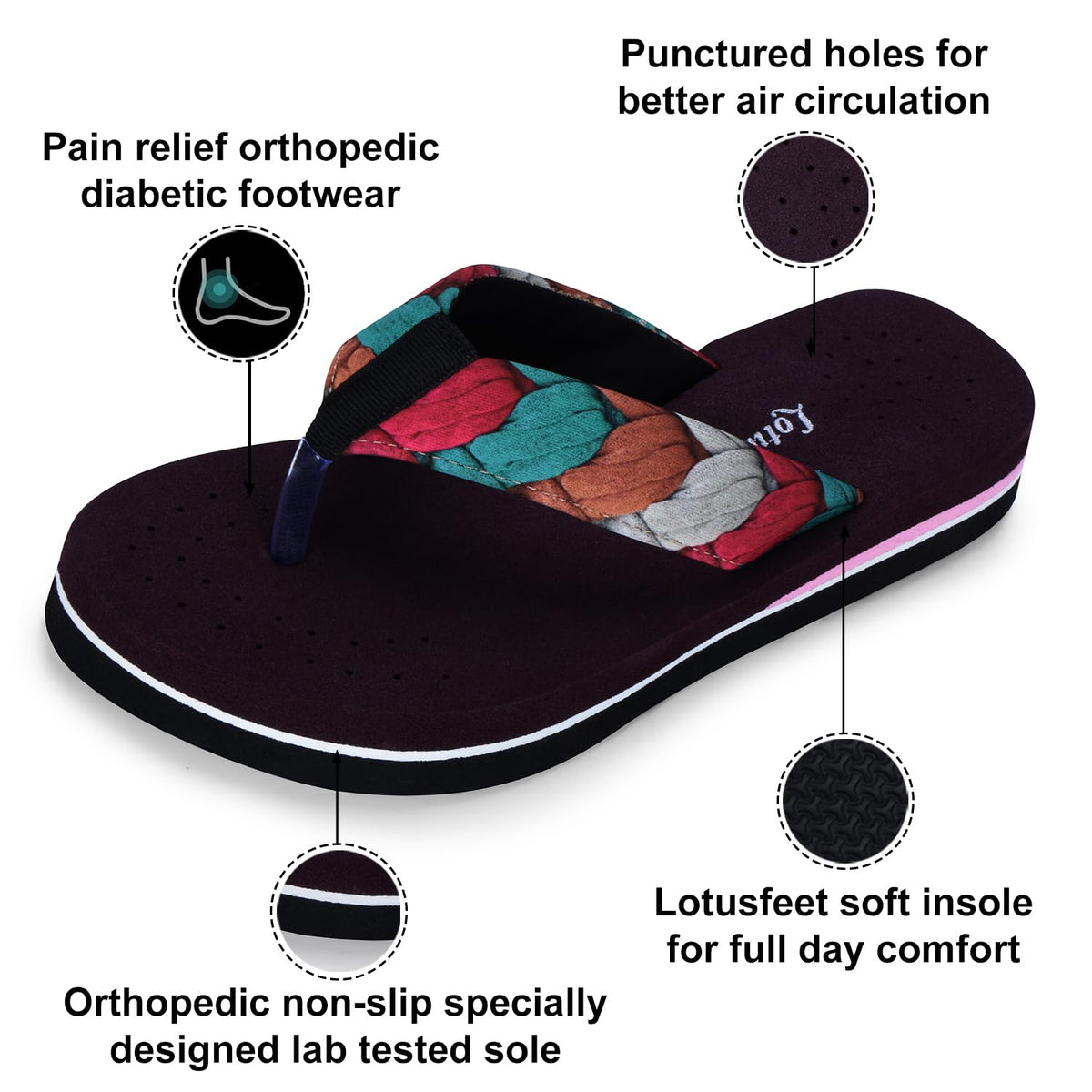 • LIGHT WEIGHT AND DURABLE: - They Are Extremely Light Weight and Durable Slippers and Are Widely Used by Women / Ladies for All Ages, Especially Old Aged, Expecting Women (Pregnant Women), Women with Foot, Knee and Back Pain, Arthritis, Plantar Fasciitis, Etc.These Lotusfeet Slippers are mostly used by Women’s of all ages, Especially old aged suffering from Diabetes, Plantar fasciitis, Orthopedic Pain, Heel Pain, Arch Pain, Ankle Pain, Knee Pain and Back Pain